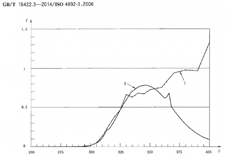 1B 型(UVA-351)熒光紫外燈:這種燈在300nm下的輻射低于總光能輸出的2%,在353nm有發(fā)射峰,用來(lái)模擬經(jīng)窗玻璃后日光的紫外部分,這種燈通常被稱秋UVA-351(見(jiàn)表2)。附錄A中的圖A.2為250nm~400nm下典型的1B型(UVA-351)熒光燈對(duì)比經(jīng)窗玻璃過(guò)濾后日光的光譜輻照度圖。2型(UVB-313)燈可在相關(guān)方協(xié)商同意下使用,但協(xié)商意見(jiàn)應(yīng)在試驗(yàn)報(bào)告中指出。