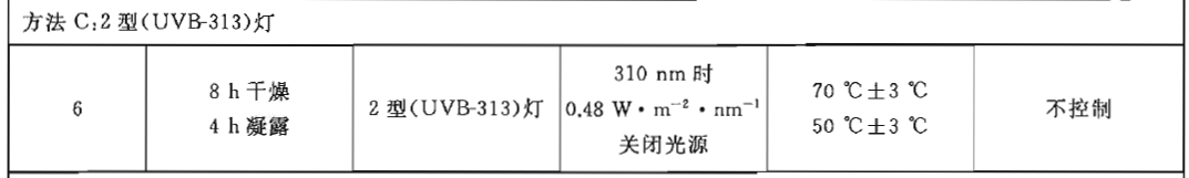 表4給出了人工氣候老化(方法A)、窗玻璃后日光(方法B)和2型(UVB-313)燈(方法C)進(jìn)行試驗(yàn)的多組暴露循環(huán)條件。